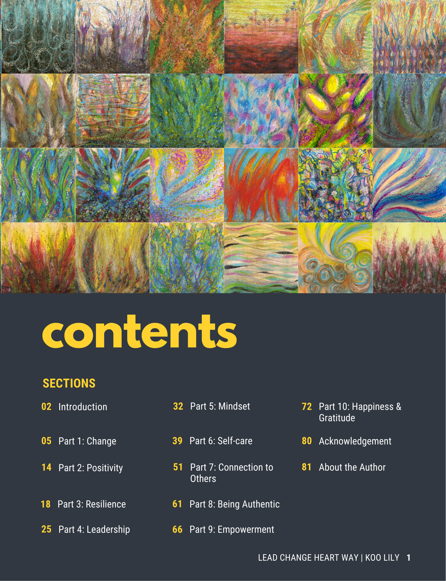 LEAD CHANGE HEART WAY is a compilation of Koo Lily's artwork accompanied by personal reflections and observations, showcasing her journey of self-discovery and transformation during the Covid-19 pandemic. Forced to confront her raw emotions, Lily tapped on the therapeutic benefits of art through art therapist, Rita Eckhart's 40-day challenge, leading her to create an artwork each day. As she continued the practice, Lily noticed deeper meanings in her written reflections and felt transformed from the inside out. This book offers a heartfelt journey of art and words that will guide and connect readers on their own journeys of transformation.