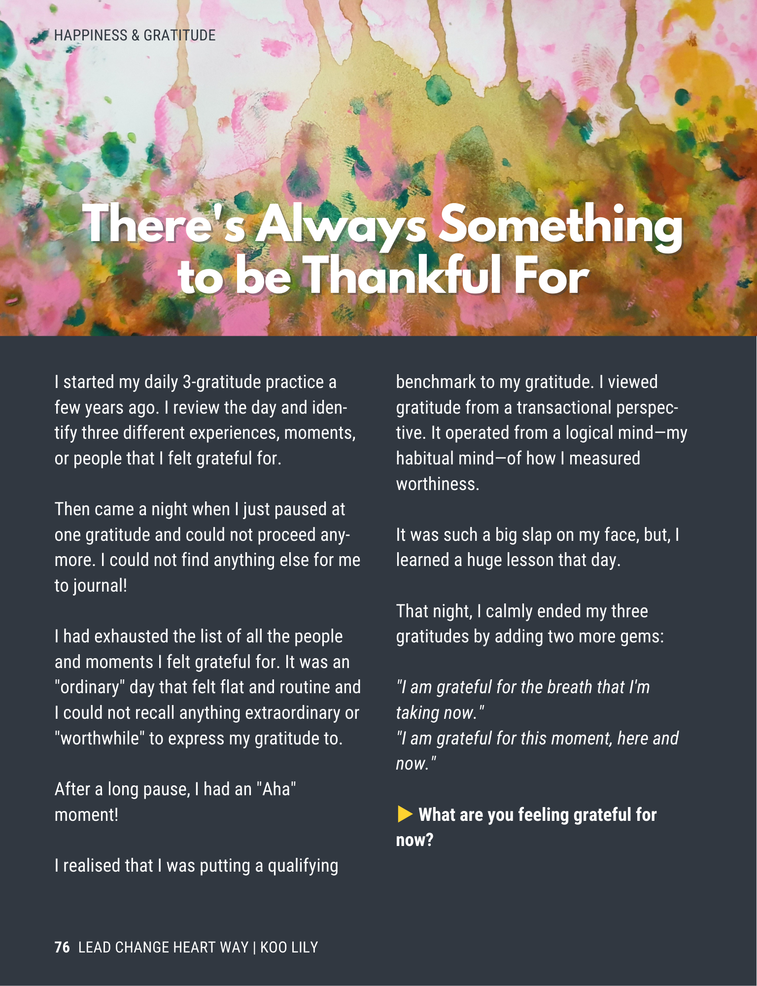 Currently residing in Kuala Lumpur with her husband and teenage daughter, Lily's debut book, "Lead Change Heart Way" reflects her belief that awareness initiates change, and authentic change yields results.