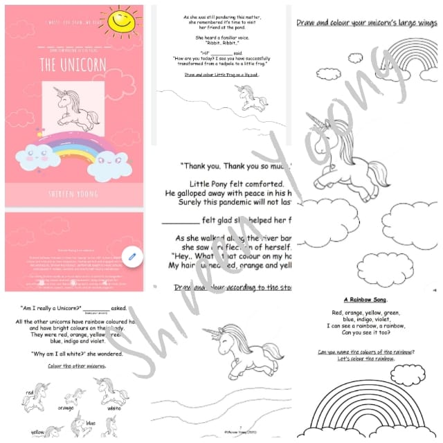 Kids learn about colours of the rainbow through the story they read. They give a name to the Unicorn and illustrate the book through the prompting of the writer. ___, the Unicorn wondered if she is a real unicorn as she looks different from her friends. (She is all white, you see. No colours on her mane.) Little did she know, that every time she does a good deed, her mane changes colour. Mummy Unicorn was proud of her when her baby learnt to love and extend help to her friends. The moral of the story - To love and be kind to one another.